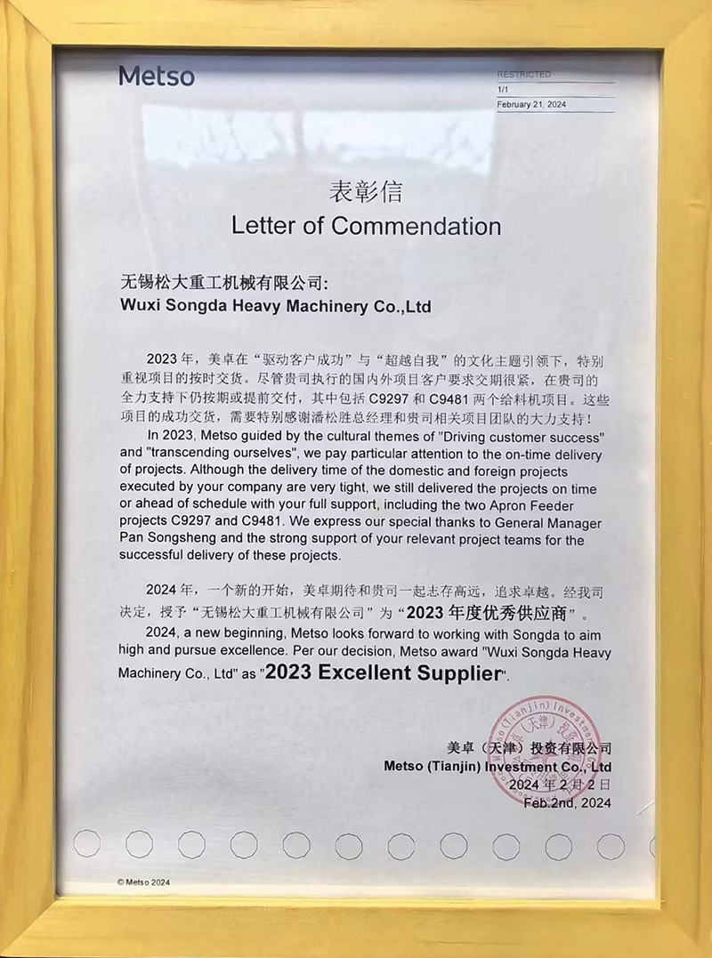 收到新年最好的禮物??,評為美卓礦機2023年度優(yōu)秀供應商,這是客戶對松大的認可及信任,在新的一年里更需要努力加油??,不辜負這份榮譽,其他客戶也是如此,客戶的認可是我們最大的激勵及動力,新的一年里帶領(lǐng)松大全體同仁更上一層樓!??!